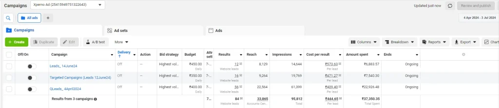 - The results included an average CPL of INR 450, ad spend of INR 37,350, revenue of INR 5,60,000, and an average RoAS of 13.1x over 90 days.